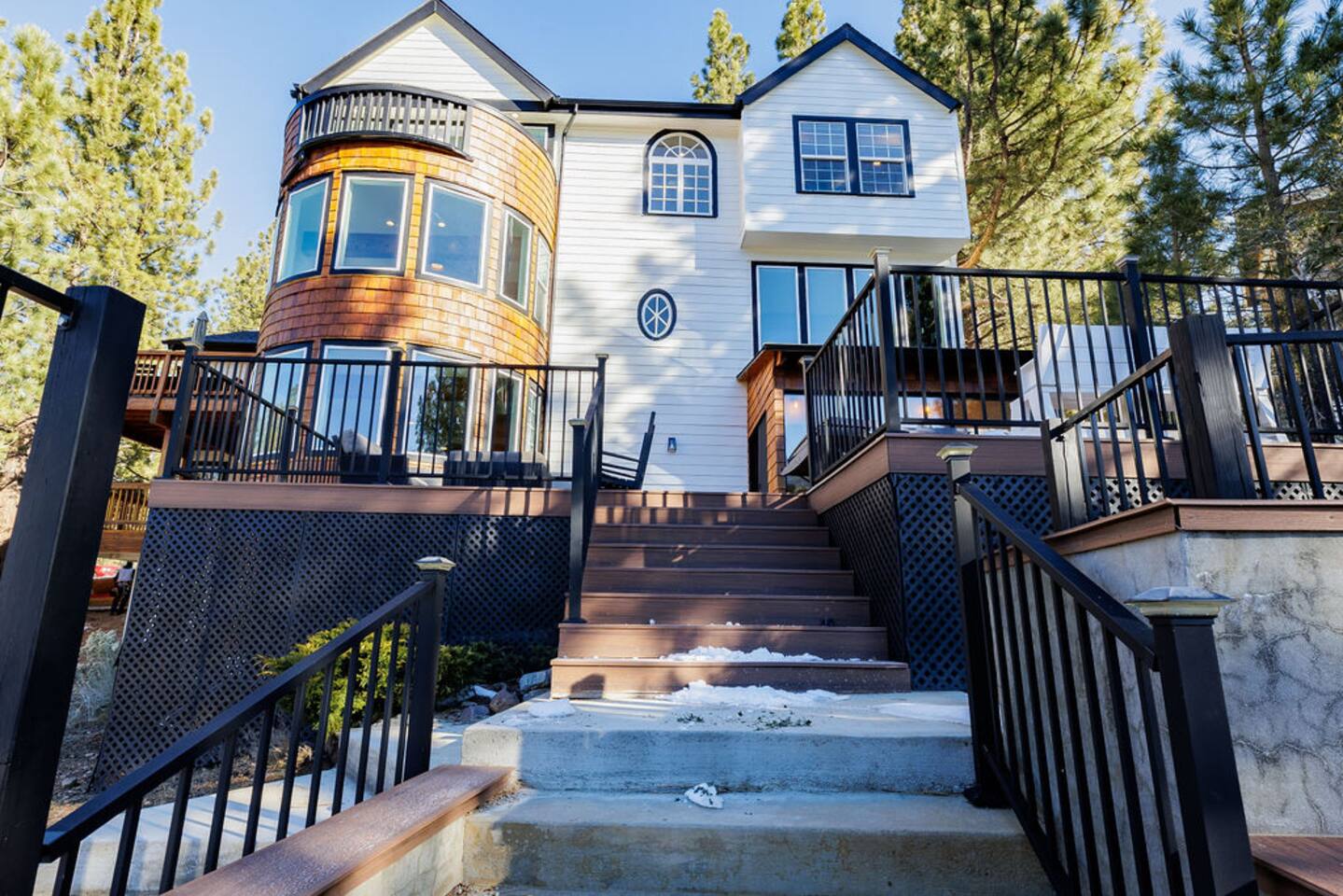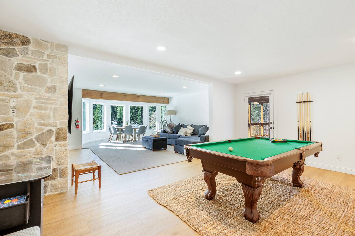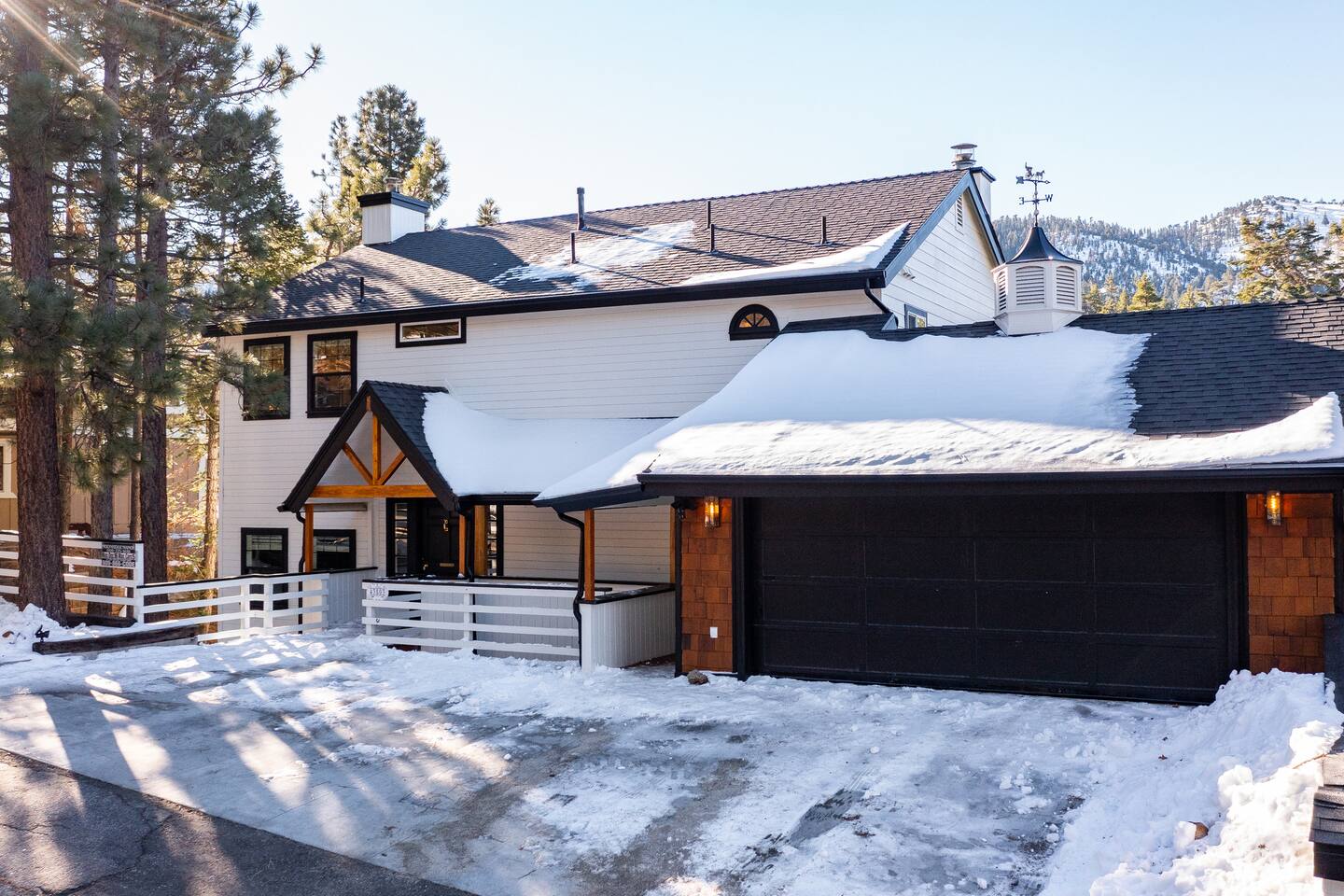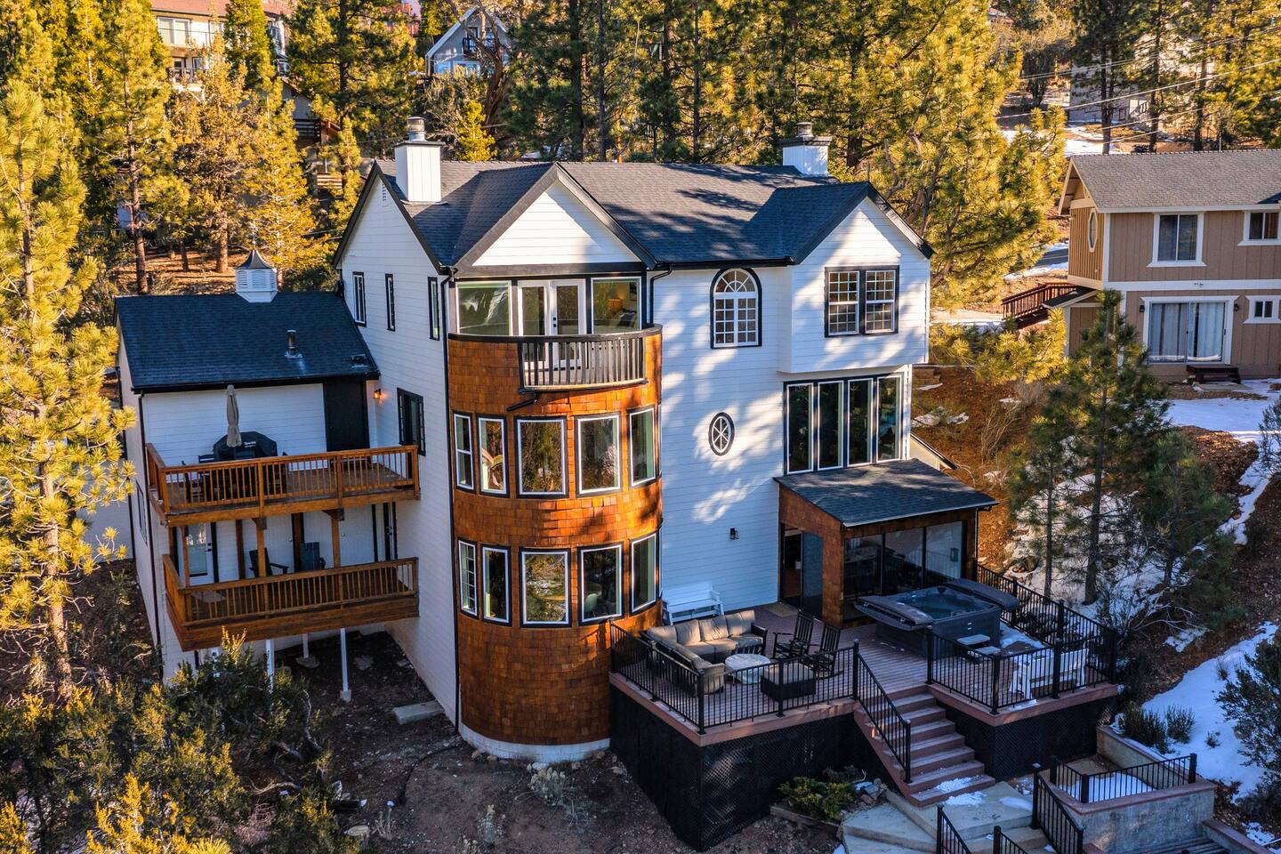 Renovated March 2022 - new furnishings! Close to Big Bear Mountain Resort. This is a 4000 sq foot home and has 3 levels, 5 bedrooms, 4 full baths with an additional half bath, full kitchen, library, entertainment room, pool table, sauna, spa, multiple decks, bbq. This home is unique and charming and you can enjoy breathtaking views around the entire home.