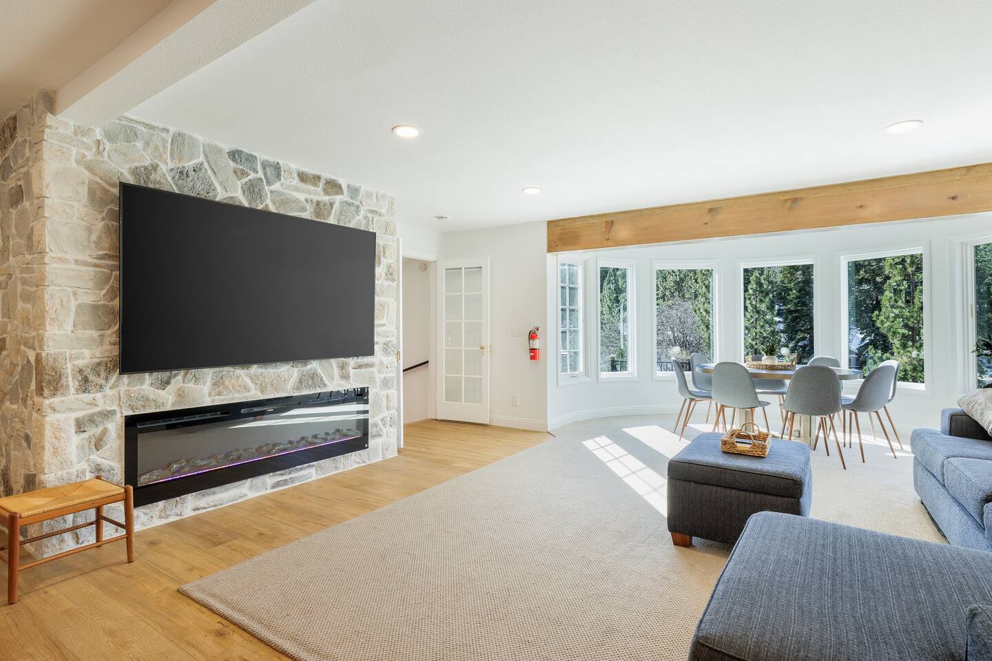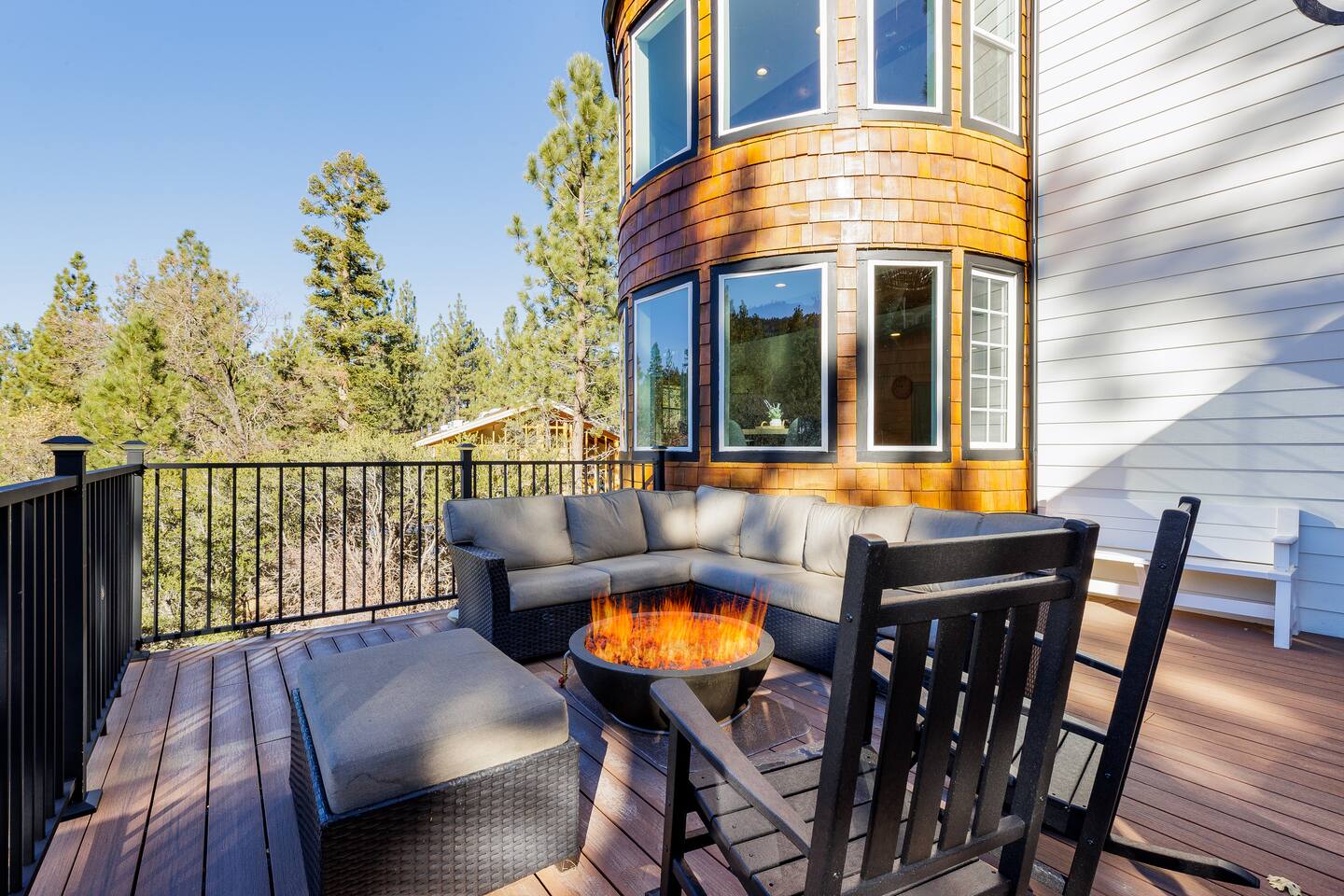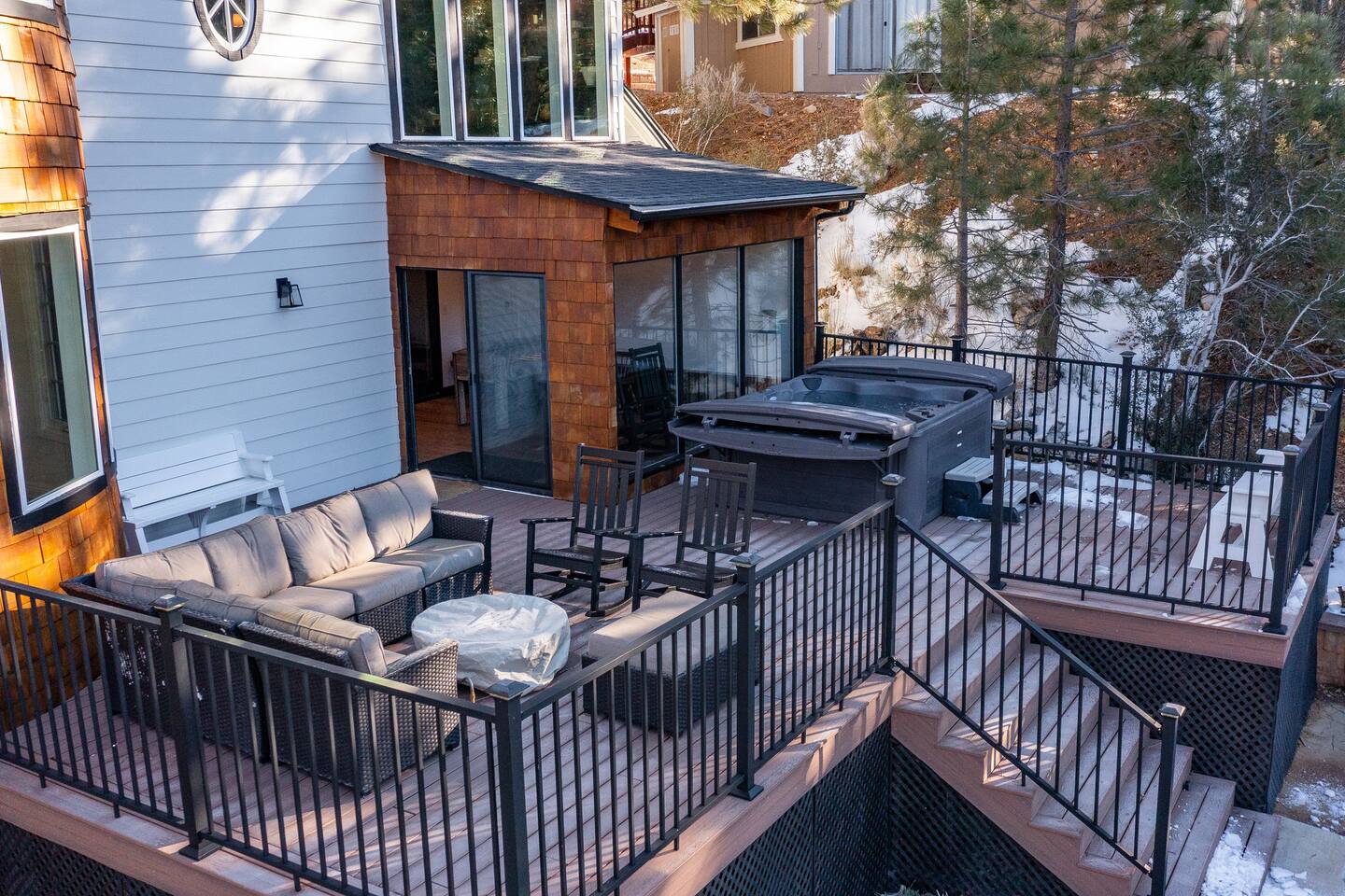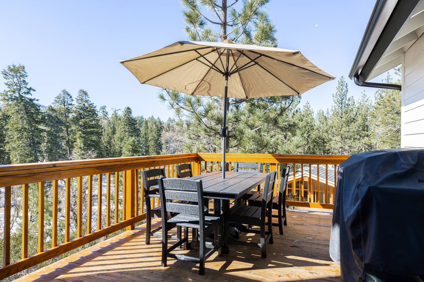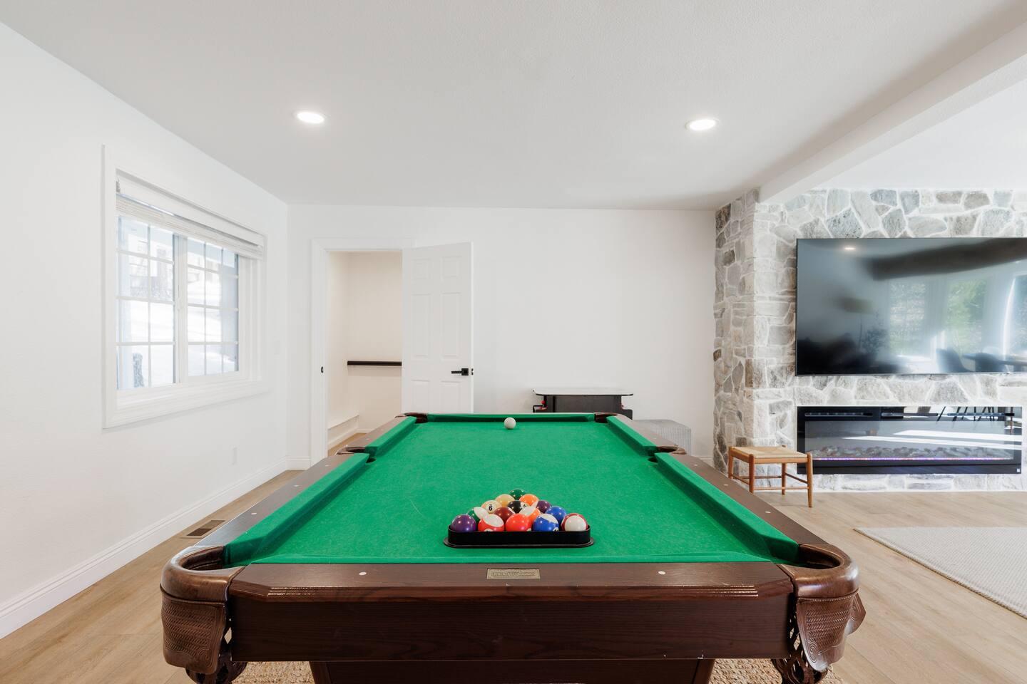 Renovated March 2022 - new furnishings! Close to Big Bear Mountain Resort. This is a 4000 sq foot home and has 3 levels, 5 bedrooms, 4 full baths with an additional half bath, full kitchen, library, entertainment room, pool table, sauna, spa, multiple decks, bbq. This home is unique and charming and you can enjoy breathtaking views around the entire home.